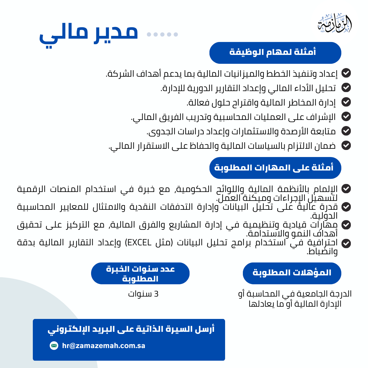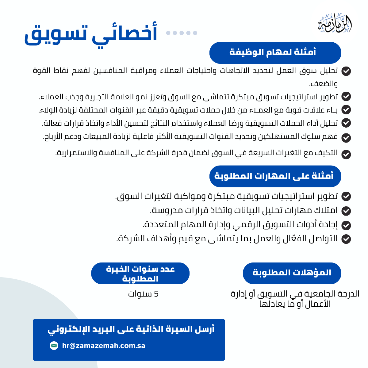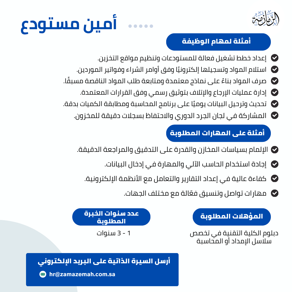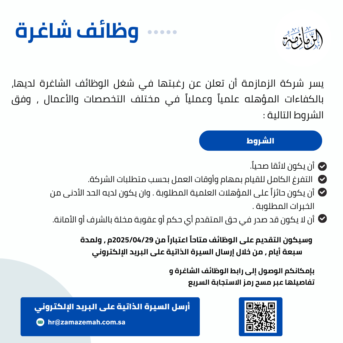 وسيكون التقديم على الوظائف متاحاً اعتباراً من 2025/04/29م ، ولمدة خمسة أيام ، من خلال إرسال السيرة الذاتية على البريد الإلكتروني التالي: hr@zamazemah.com.sa